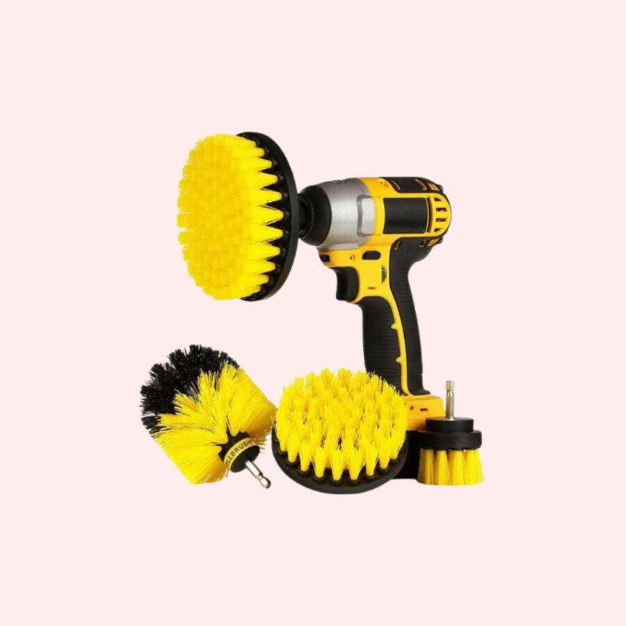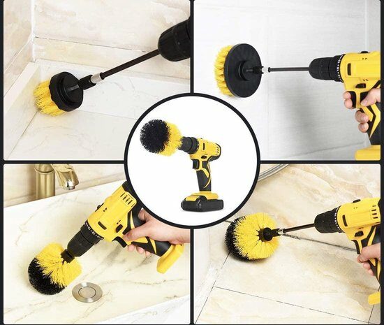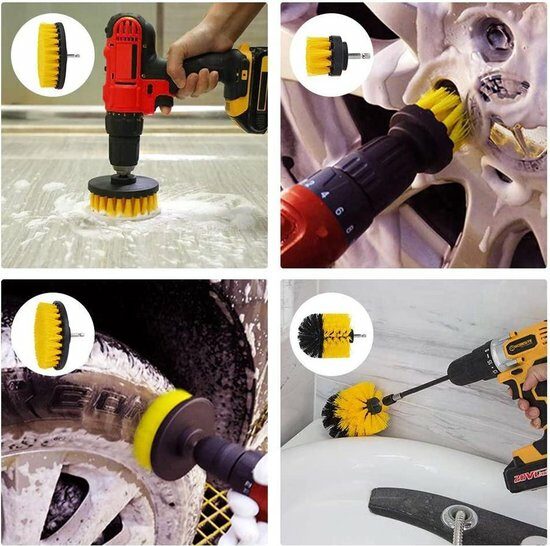 4 delige Borstelset voor Boormachine | Schrobborstel Opzetstuk | 4 maten Boorborstels | Reinigingsborstels voor Binnen en Buiten | 50mm / 100mm / 120mm / 89mm | Geel