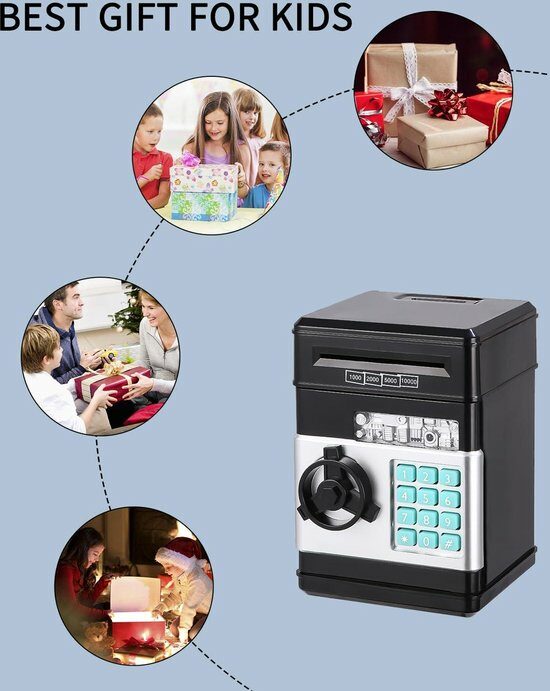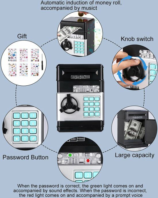 Deze elektronische spaarpot is gemaakt van hoogwaardig ABS-kunststof en is een geweldig cadeau voor kinderen om hen te helpen het concept van sparen en goede spaargewoonten te leren. Met schattige stickers voor kinderen om het plezier te vergroten.