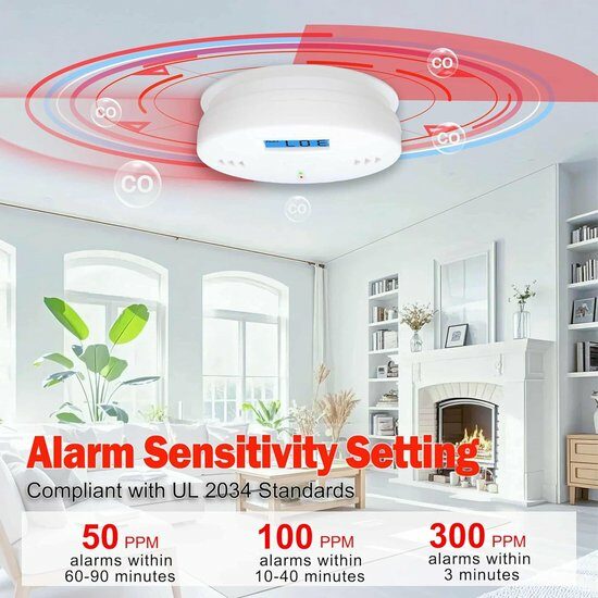 Directe waarschuwing – Wanneer koolmonoxidemelders het alarmniveau bereiken, detecteert de koolmonoxidemelder koolmonoxide, knippert de rode LED en licht de blauwe achtergrondverlichting van het lcd-scherm op. Een vroege waarschuwing wordt afgegeven via een luid alarm van 85 decibel.