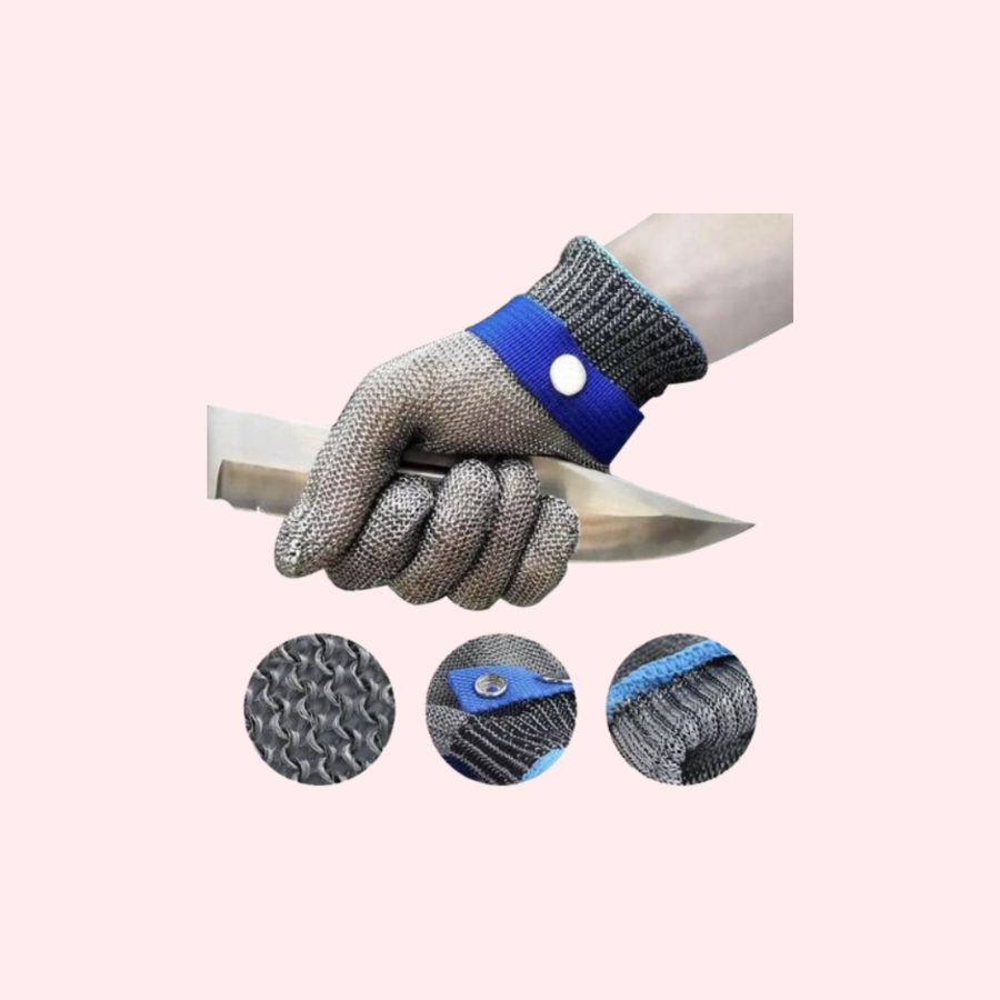 Met deze handschoen kan je makkelijk oesters openen, terwijl ze een goede bescherming biedt tegen zowel het mes als de scherpe randen van de oesterschelpen. De handschoen is gemaakt van roest vast staal met een dicht patroon van maliën. Hieronder zit een witte onderhandschoen, zodat het extra comfortabel aanvoelt wanneer je de handschoen draagt.
