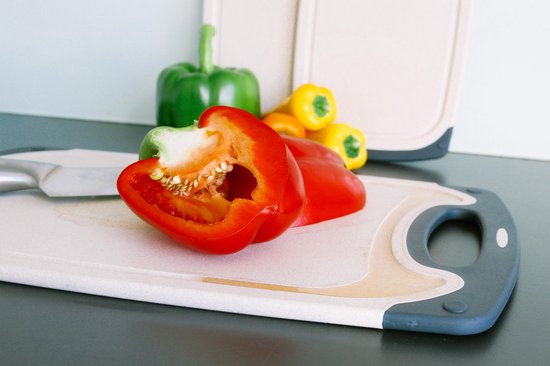 Maak gebruik van beide kanten van de snijplank. Aan de ene kant de groeven om het sap tegen te houden en aan de andere kant een compleet egaal oppervlak.
