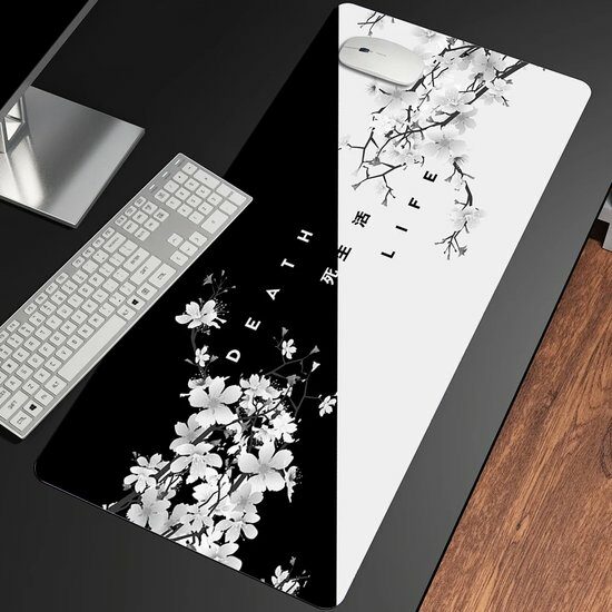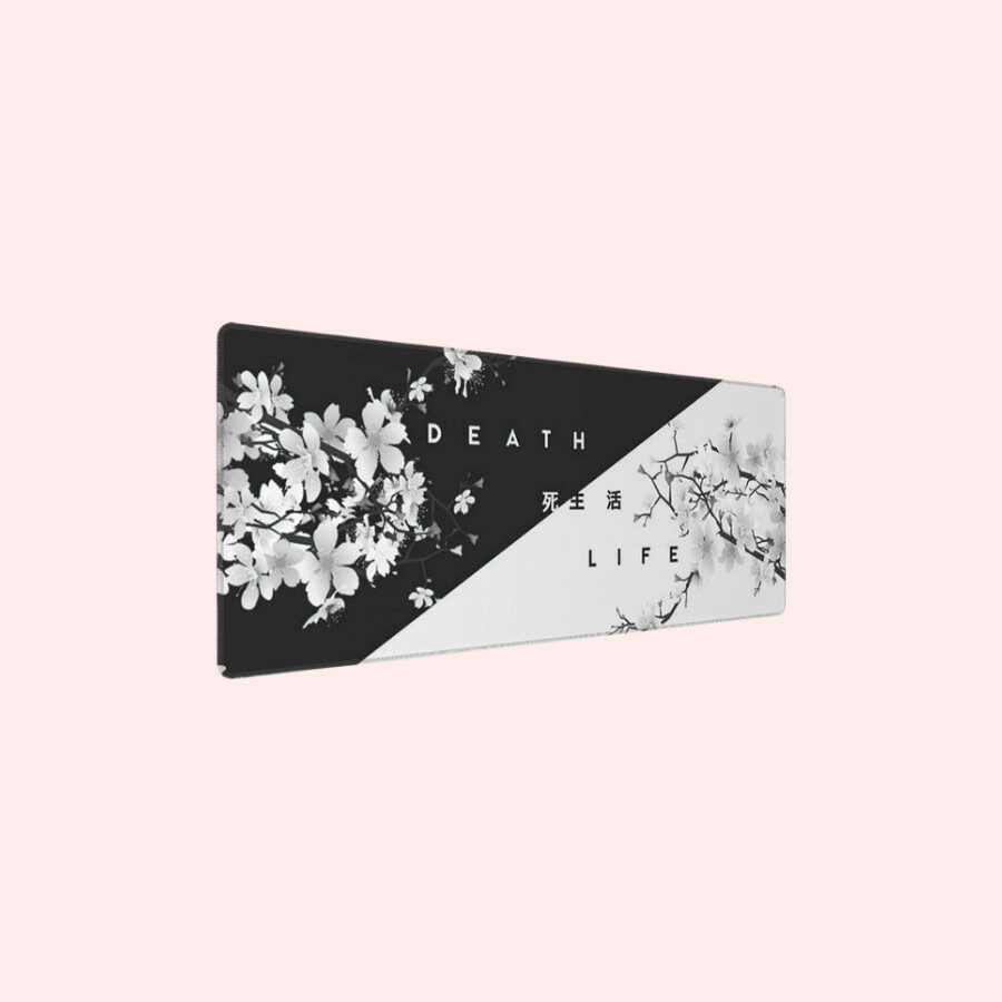 Stijlvolle muismat met zwart-wit cherry blossom design. Symboliek van LIFE & DEATH – perfect voor gamers, designers en minimalistische setups.