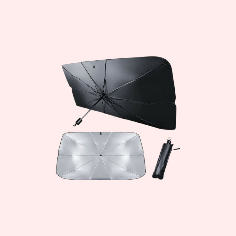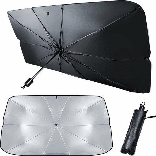 Zonnescherm Auto Voorruit Paraplu-Type – standaard (140×80 cm) Handig zonnescherm dat aan de binnenzijde van de voorruit wordt bevestigd. Reflecteert zonlicht en houdt de auto koeler bij parkeren. Bescherm het interieur tegen UV-straling